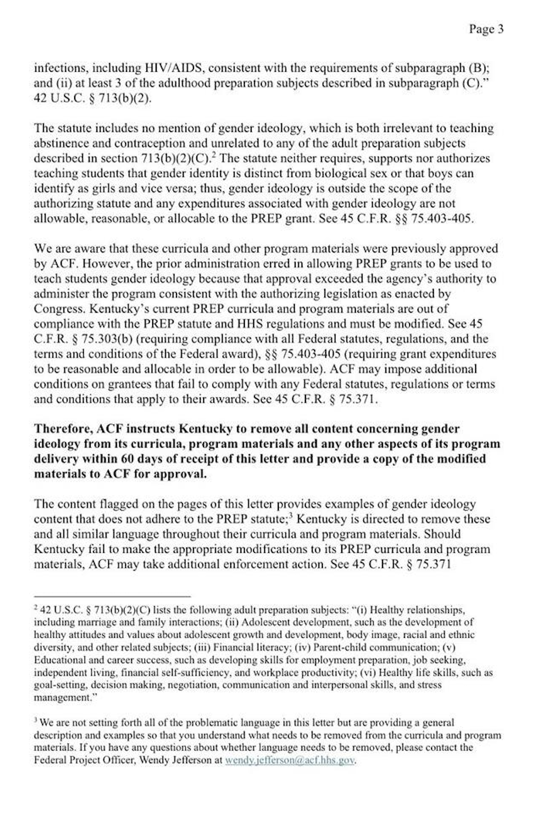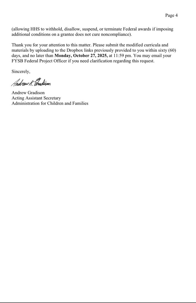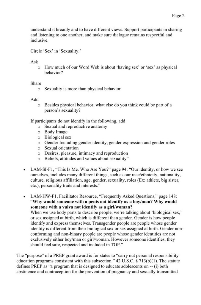 The U.S. Department of Health and Human Services (HHS) issued letters warning states that continued inclusion of this content in the Personal Responsibility Education Program (PREP) violates the scope of the grant established under the Affordable Care Act.