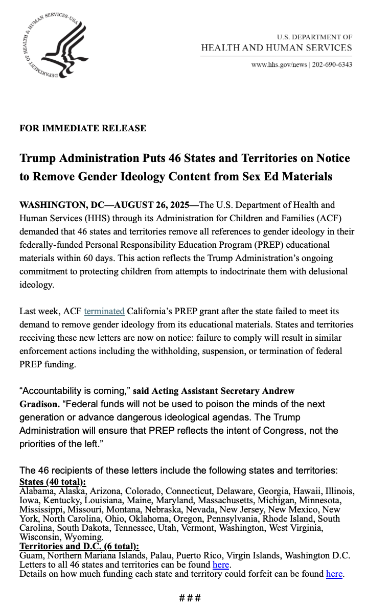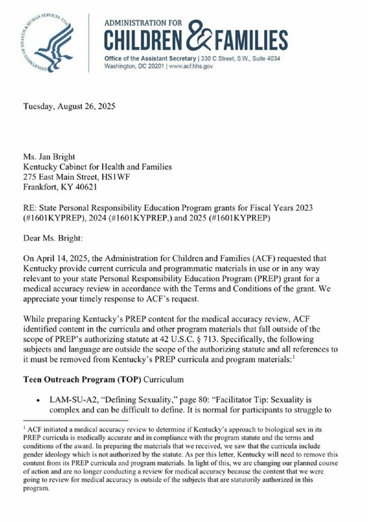 WASHINGTON, DC — AUGUST 26, 2025 — The Trump Administration has put 46 states and territories, including Kentucky, on notice to remove gender ideology from federally funded sex education curriculum.